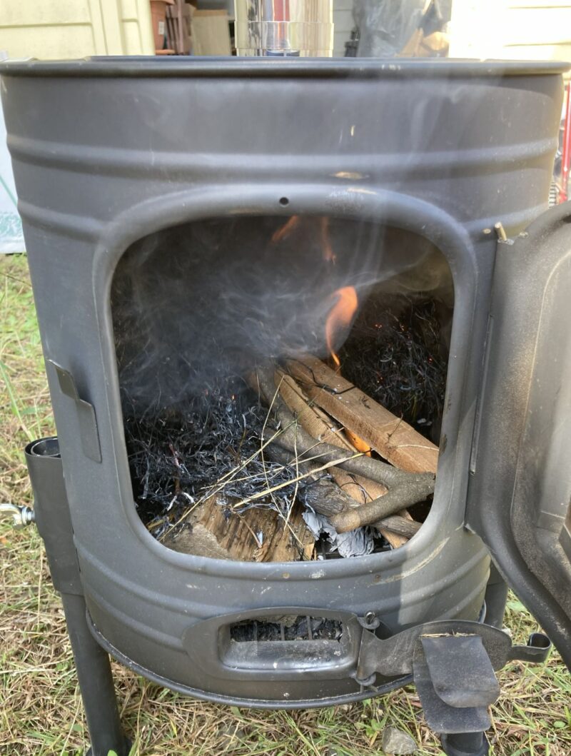 焚き付け用の薪と庭の刈り取った雑草を乾燥したもので火をつけましたが、煙が出ます。