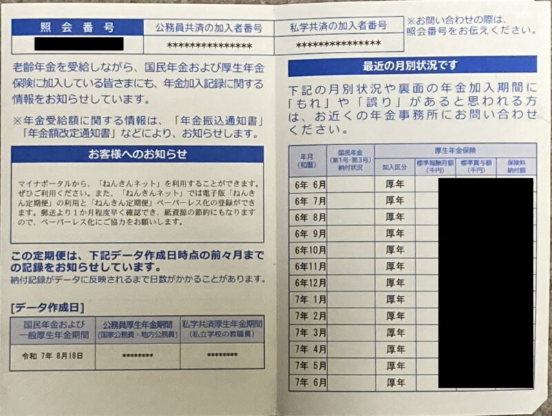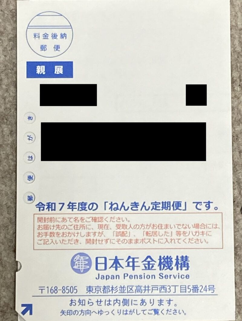 今年(令和7年度)の年金定期便のはがきが届きました。