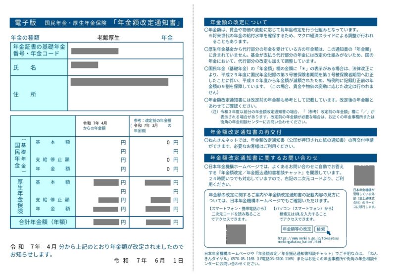 「年金額改定通知書」とは、法律の規定により、物価や賃金の変動に応じて年度ごとに年金額が改定されたときに、改定後の年金額をお知らせするものです。