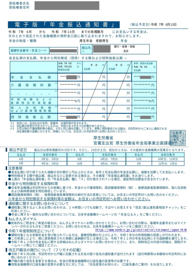 「年金振込通知書」は、毎年6月に金融機関等の口座振込で年金を受け取られている方に対して、6月から翌年4月(2カ月に1回)まで毎回支払われる金額をお知らせするものです。