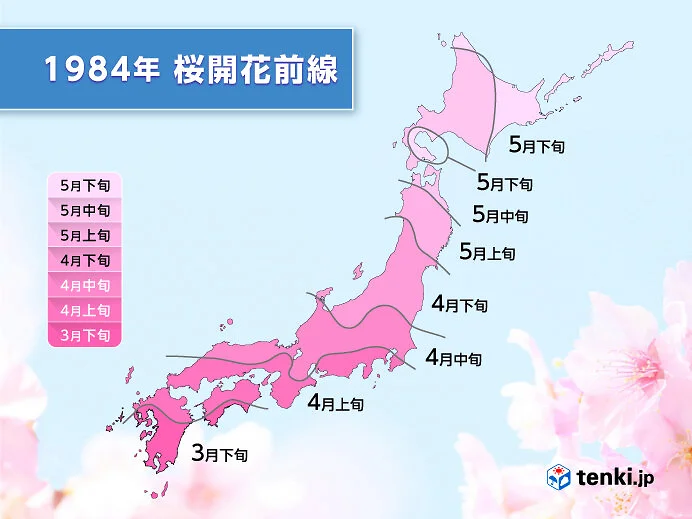 1984年は開花が非常に遅く、九州でも3月下旬北海道では5月に入ってからの開花でした。