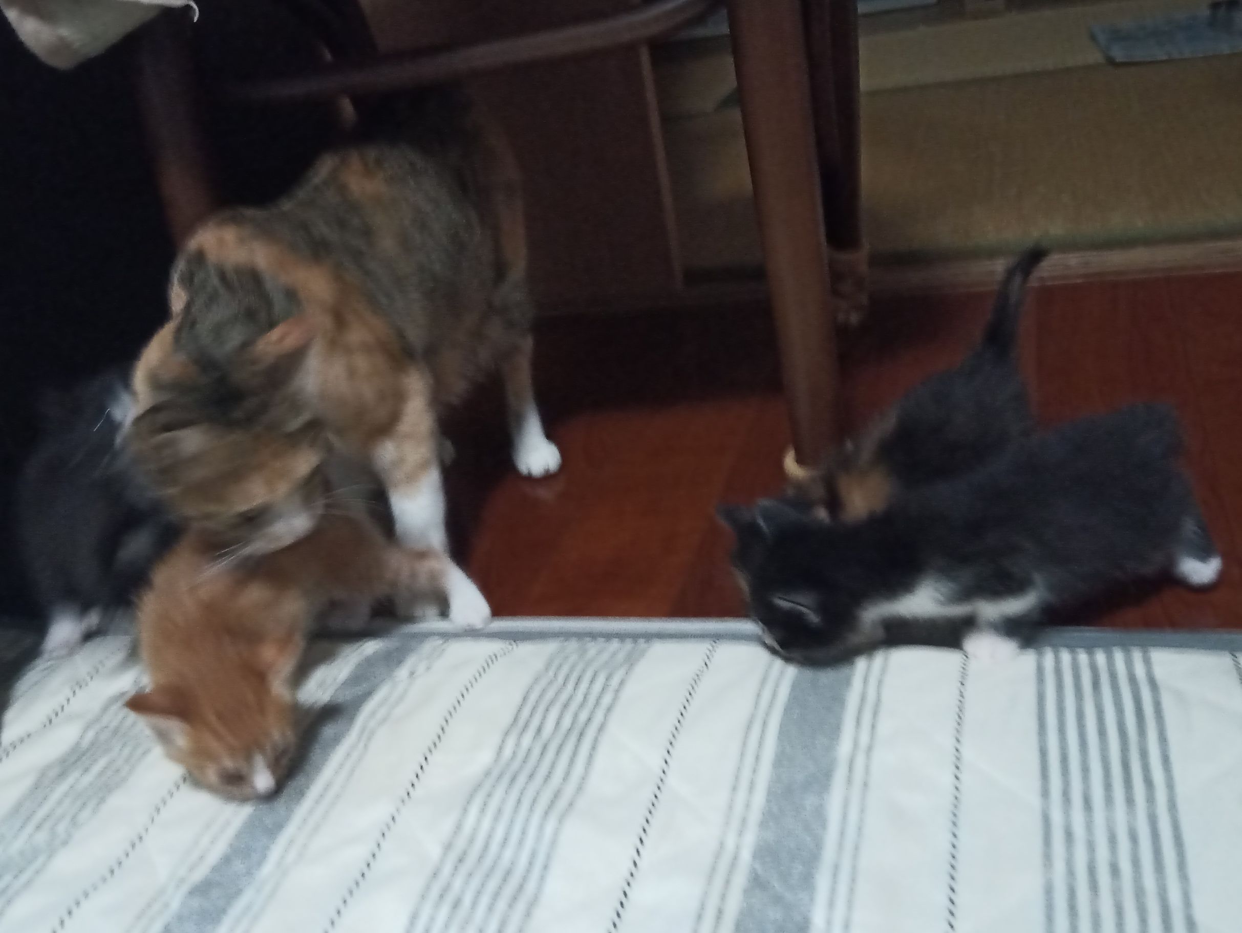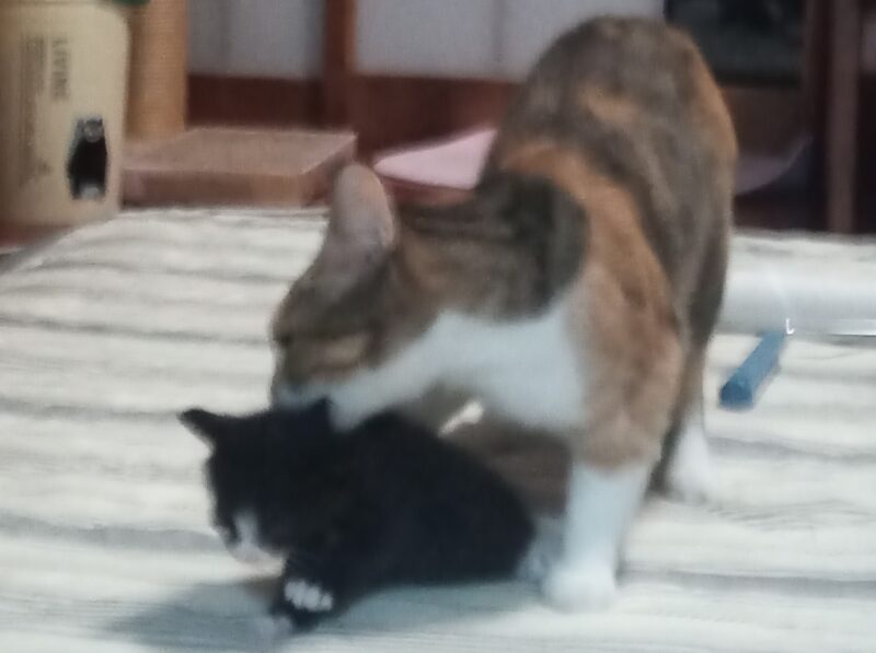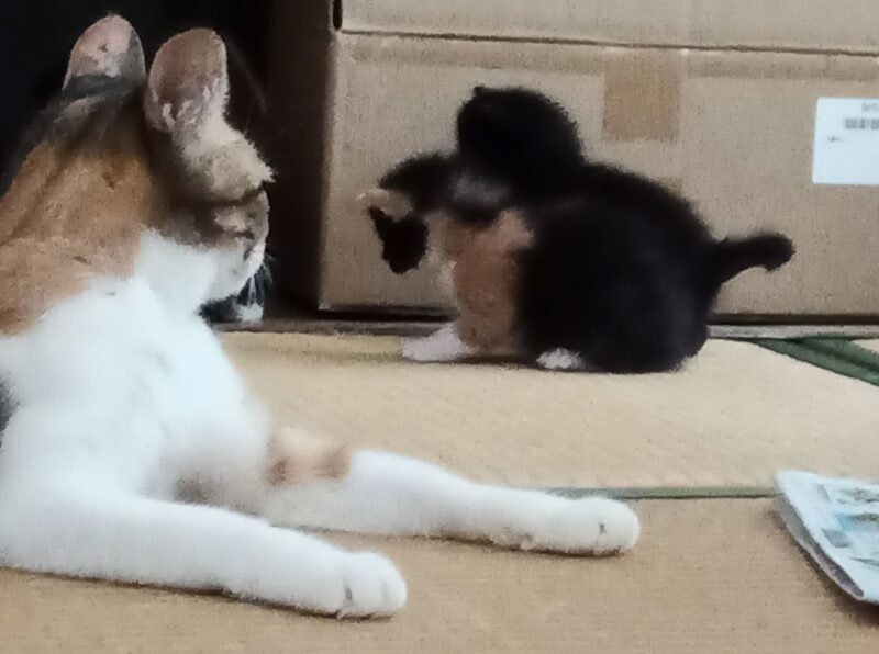 子猫が箱の外に出るようになると、母猫は大忙しです。