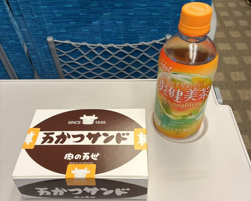 朝早かったため、東京駅で朝食の「万カツサンド」を買って新幹線に乗り込みました。